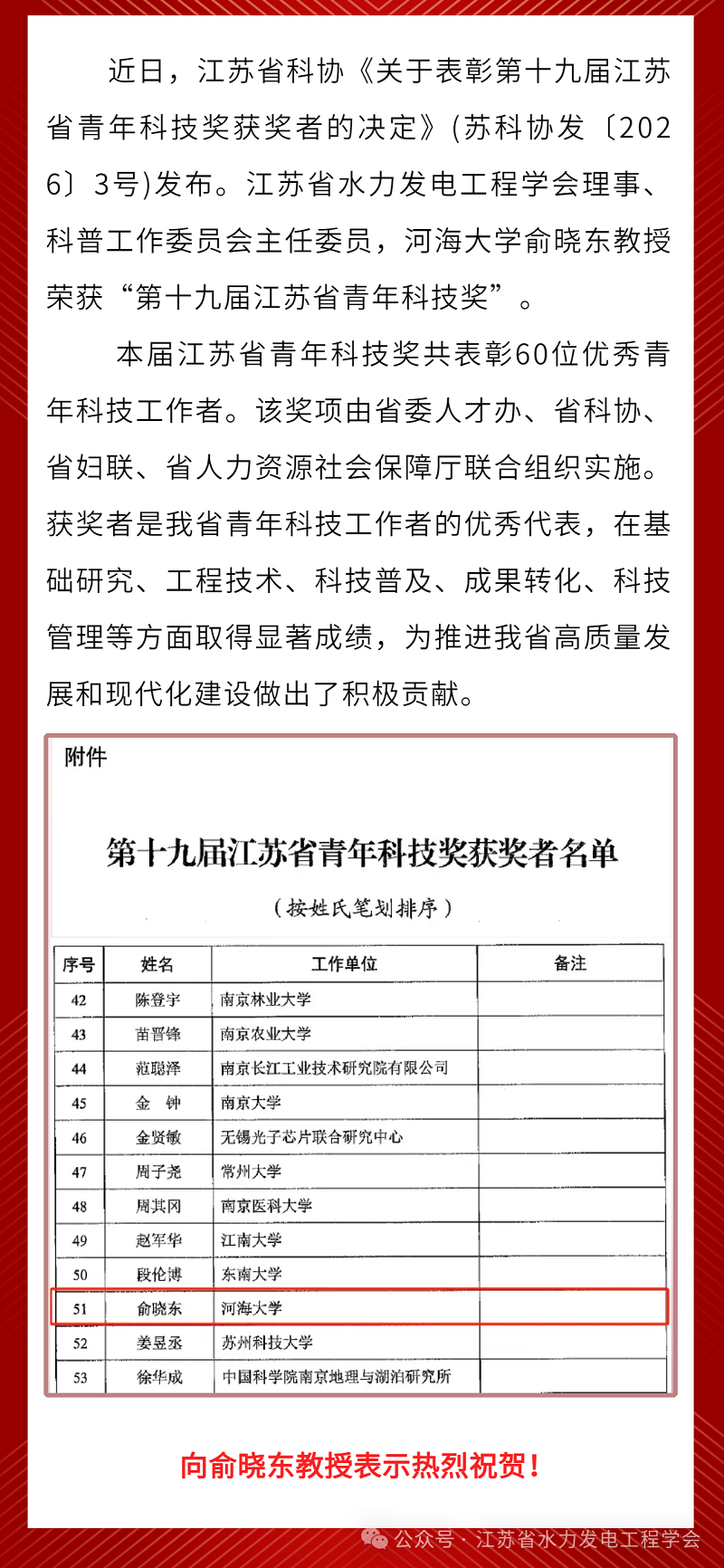热烈祝贺!江苏省水力发电工程学会理事俞晓东教授荣获第十九届江苏省青年科技奖